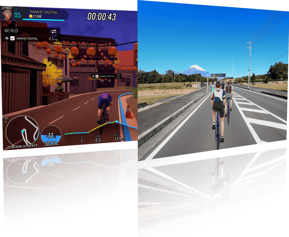 実写と3Dによる仮想空間の両方の映像に対応。GPSデータから勾配変化の負荷を忠実に再現しているため、試走やトレーニングに最適。どちらのコースでも3DCGでモデリングした自身のアバターが走るため、他のユーザーとの並走やレースを楽しめます